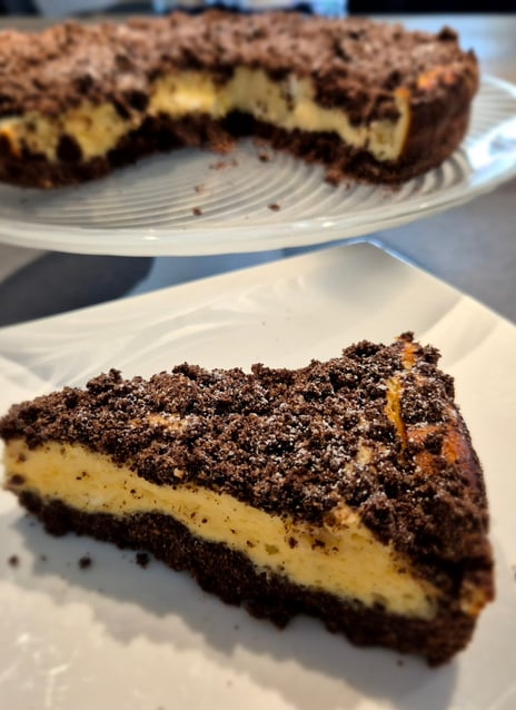 Für den Mürbteig einfach alle Zutaten zusammenmischen. Es wird ein bröseliger Teig. Eine Tortenform einfetten und die Hälfte des Teiges hineindrücken, so dass er zusammenhält. Dann die Topfenfülle zubereiten. Hier ebenfalls einfach alle Zutaten vermischen. Auf dem Schoko Teigboden verteilen und die zweite Hälfte des Schoko Mürbteiges darauf bröseln.